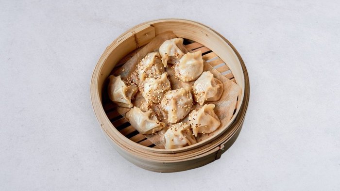 Jiaozi z warzywami, makaronem sojowym i jajkiem